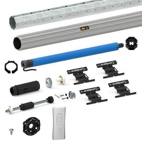 Silnik sterowany radiowo, umieszczony w teleskopowej rurze ośmiokątnej Ø 40 mm, napędza pancerz rolety za pomocą zaczepów zatrzaskowych do lameli o grubości 8 mm lub 14 mm, dołączonych do zestawu.